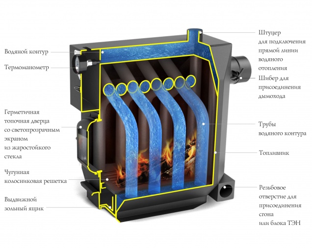 Всестороннее экранирование топливника конвективными трубами позволяет максимально использовать для нагрева воды тепловое излучение горящего топлива и тепло, содержащееся в дымовых газах.